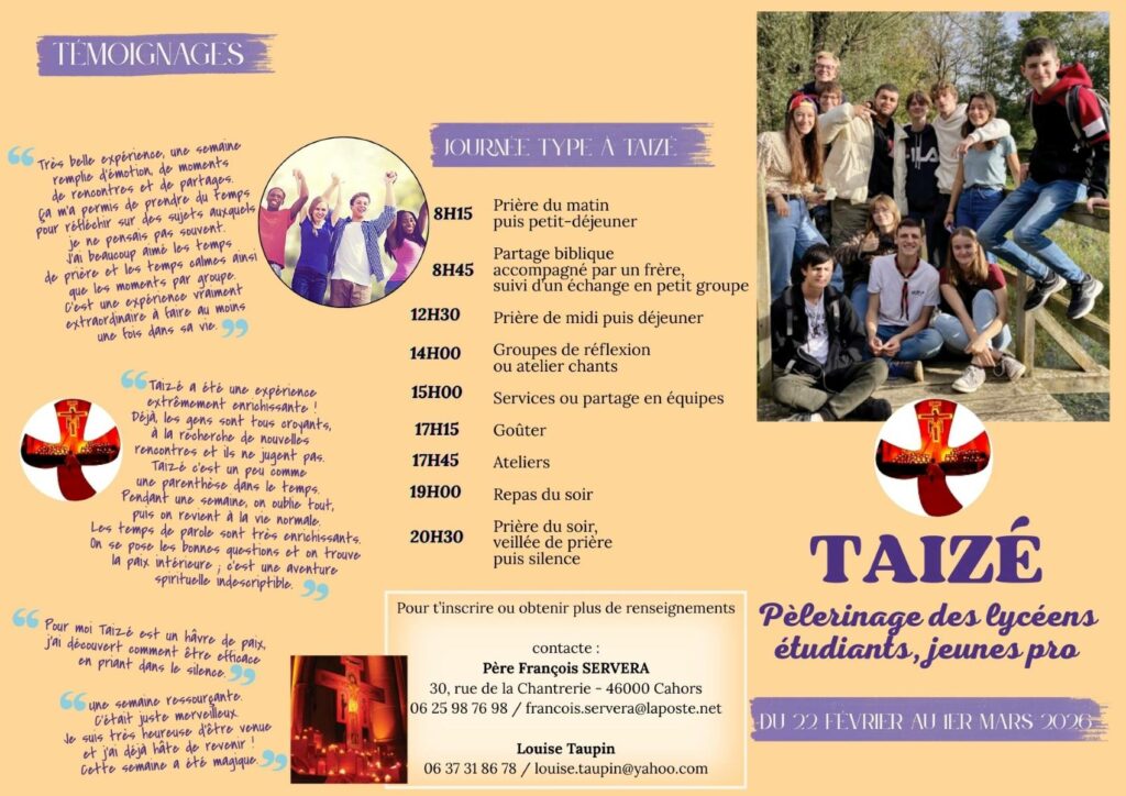 Pour plus d’informations et pour s’inscrire, contacter le p. François : 06 25 98 76 98 – francois.servera@laposte.net
