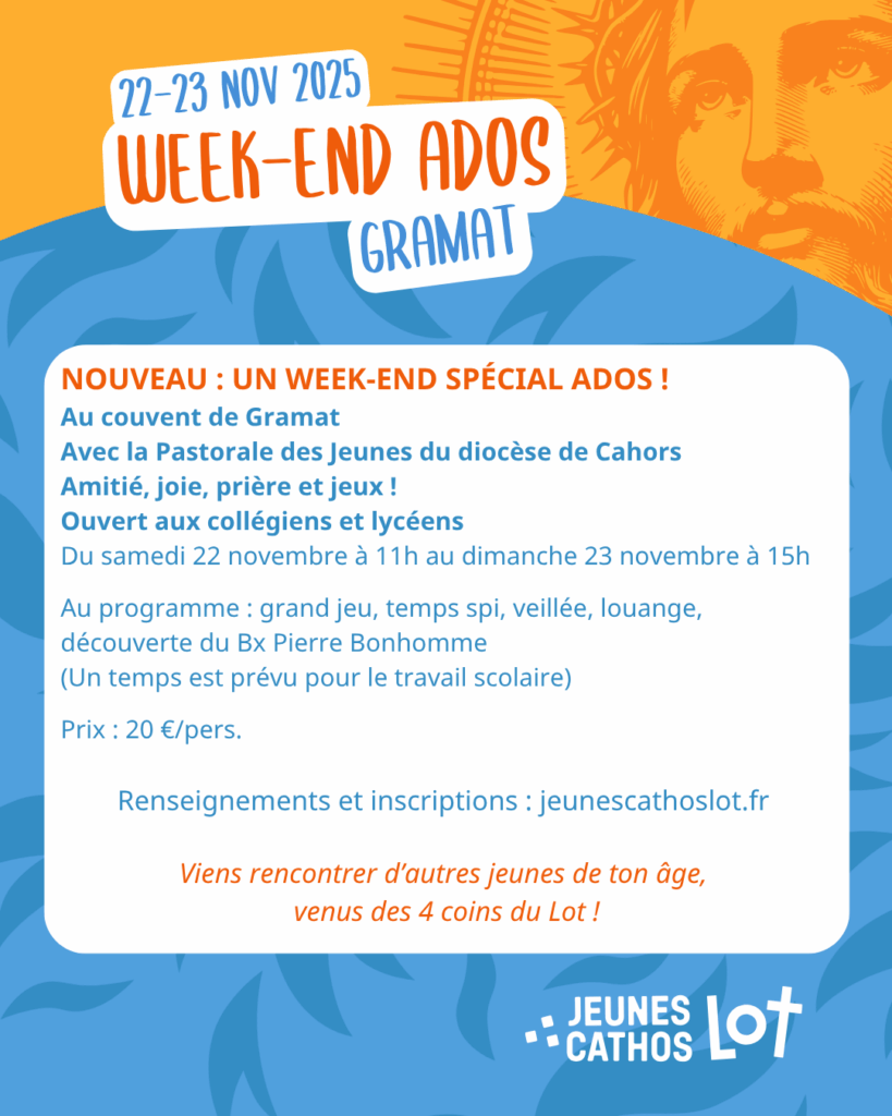 Tu es collégien ou lycéen ? Alors tu as rendez-vous les 22 et 23 novembre à Gramat pour un week-end inoubliable avec d’autres jeunes de tout le diocèse !